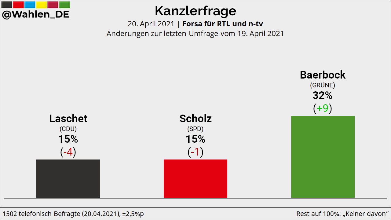 Forsa-Umfrage - Nach Nominierung von Armin Laschet im freien FallDie Kanzlerfrage bei der Union ist geklärt erste Umfragen aber zeigen. Bei der Frage wer alles in allem das TRiell gewonnen habe stimmen 36 Prozent für Olaf Scholz 30 für. Das ergab eine aktuelle Zuschauer-Befragung von Forsa im Auftrag von RTL und ntv.